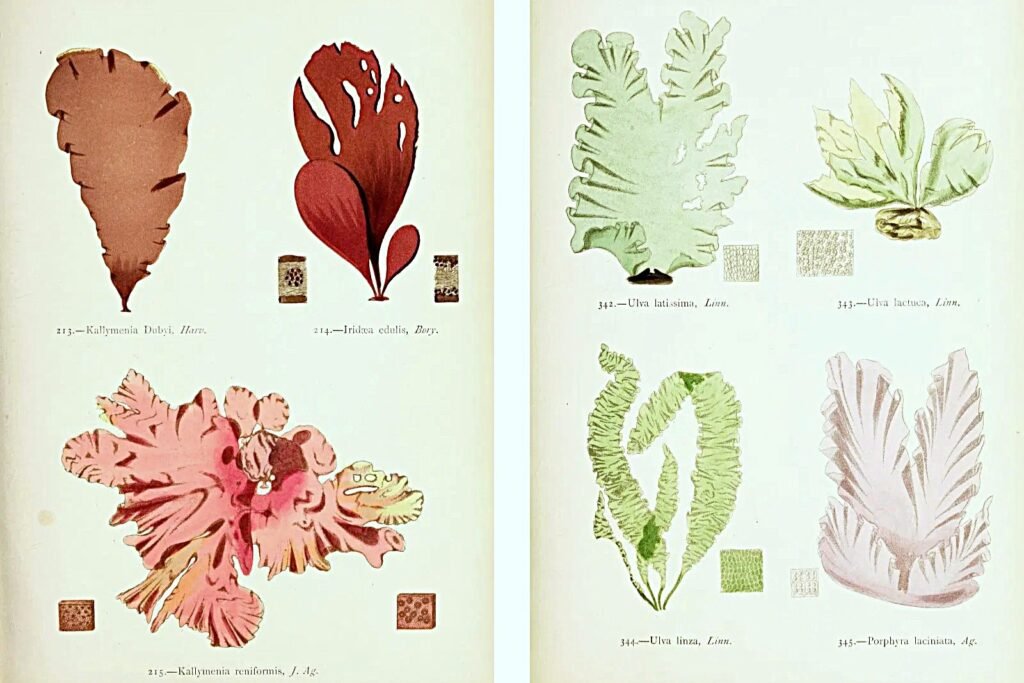 Species of the Kallymenia genus, left, and Ulva genus seaweeds (Margaret Gatty, 1872). Credit: Biodiversity Heritage Library