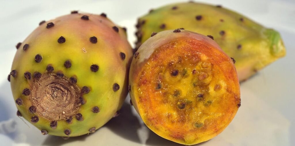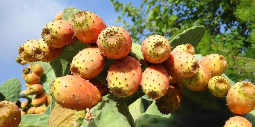 Fruits (Tunas): The fruit, called “tuna” or prickly pear, is a pear-shaped, colorful, sweet fruit that grows on the pads of the cactus. The fruit can be red, purple, or yellow, depending on the variety. The flesh of the tuna is juicy, with a slightly sweet flavor and numerous small seeds that are edible.